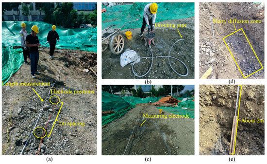 To verify the feasibility of the system in practical application scenarios, a test was conducted at a road construction site in Chengdu, Sichuan Province, China (E104.23°, N30.71°). The site exhibited complex geological conditions dominated by poorly sorted cobblestone strata. Uneven settlement and ground subsidence occurred during the construction process, which required foundation improvement by grouting and filling. Three measuring lines were deployed at the grouting site for data collection in the grouting area, with each line being 30 m long (30 electrodes spaced 1 m apart). The testing process is shown in Figure 13. The background voltage values were first measured using our system, followed by inversion imaging to determine the collapse or void locations. Grouting was then performed in the anomalous area, approximately at the 10th and 20th electrode positions along the measuring line. The system measured the apparent resistivity before grouting, 2 h after grouting and 24 h after grouting, respectively.