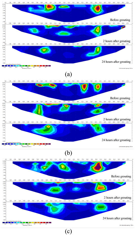 The apparent resistivity results of the site before grouting, 2 h after grouting, and 24 h after grouting are shown in Figure 14. Comparing the anomaly inversion results before and after grouting, combined with excavation verification (as shown in Figure 13d,e), it can be concluded that the system can effectively display the grouting filling range and detect the slurry diffusion. The high-resistance anomaly range is significantly reduced after grouting, indicating that the slurry has effectively filled the collapsed or fissure areas. Additionally, while the anomaly locations along the three measuring lines are generally consistent, the anomaly shapes vary, which is related to geological heterogeneity.