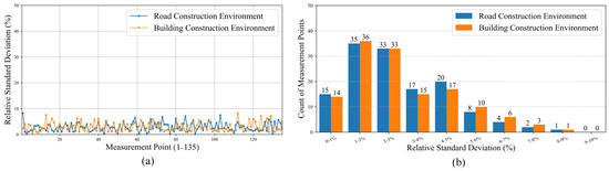 Long-term stability and environmental adaptability test of the system. (a) The RSD of measurement points in road and building construction environments. (b) The distribution of measurement points within different RSD ranges.