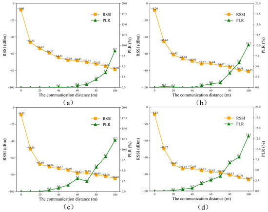 Communication quality test results of the ZigBee network in different scenarios. (a) Enclosed corridor. (b) Urban open area. (c) Complex area. (d) Construction site.