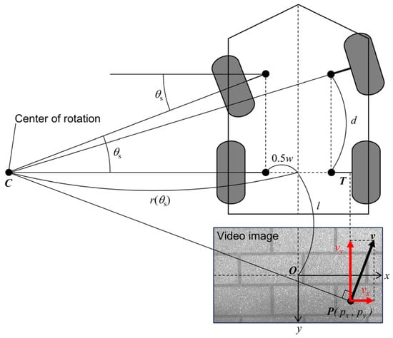 where d is the distance between the front and rear wheels, and w is the distance between the left and right wheels. The radius of curvature was also determined based on the similarity between the feature point velocity (vx, vy) and the triangle formed by the feature point position (px, py), the center of rotation, and the rear wheel shaft, as follows: