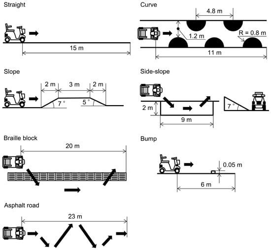 The experiment was conducted on an outdoor wheelchair training field at the National Rehabilitation Center for Persons with Disabilities, designed in accordance with the wheelchair skills test [28]. Seven courses were selected to represent conditions typically encountered when operating the MMS: straight, curve, slope, side-slope, braille block, bump, and asphalt road (Figure 3). The surface materials varied among courses, including fine asphalt for the asphalt road, tiles for the braille block, and rough asphalt for the other courses. The participants traveled through the courses on the MMS set at a maximum speed of 4 km/h, the same as the average human walking speed.