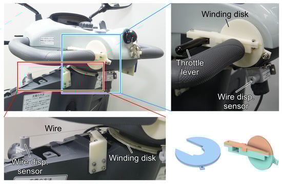 Wire displacement sensors (SM2; TE Connectivity Ltd., Schaffhausen, Switzerland) were used to measure the operating angles of the MMS as true values to validate the estimation results [17] (Figure 4). These sensors were connected to the steering wheel and throttle levers via wire-winding disks, recording the actual operating angles based on the amount of wire wound during the steering and throttle operation. The estimated steering and throttle angle were compared with the true values to assess the accuracy of the estimation. The agreement between the estimated and true values was evaluated using the 90th percentile of the absolute error. In addition, an IMU sensor (LPMS CU2; LP-Research Inc., Tokyo, Japan) was attached to the MMS body to measure the acceleration in the vehicle’s forward direction. To investigate the effect of vehicle inertia on the estimation results, this study performed a correlation analysis between the estimation errors and the forward acceleration during MMS operation. Spearman’s rank correlation coefficient was used for the analysis due to the non-normality of the data, as determined by the Anderson–Darling test. All statistical analyses were conducted using R version 4.4.2, with p < 0.05 indicating statistical significance.