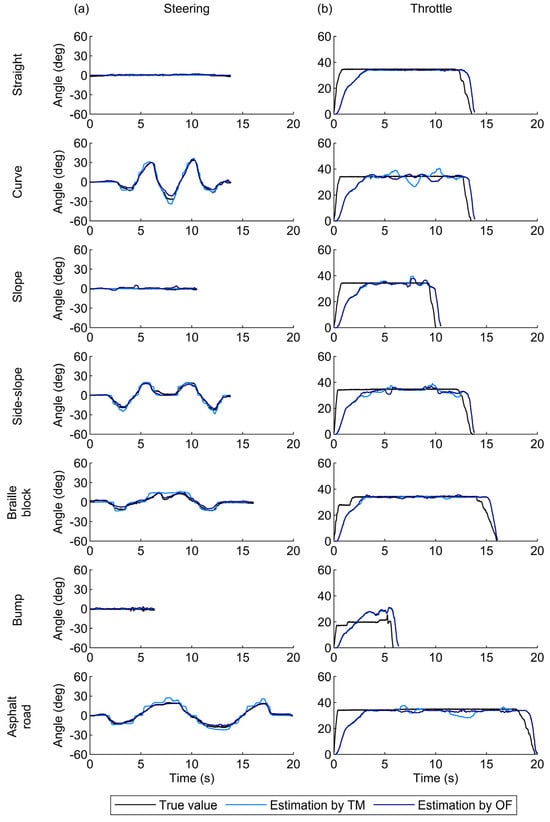 Time-series plots of (a) the steering angle and (b) the throttle angle for one participant. The dark and light blue lines represent the estimated data obtained using the optical flow (OF) and template matching (TM) approaches, respectively. The true values obtained the wire displacement sensors are represented by black lines.