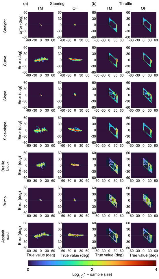 Two-dimensional histograms of the errors between the estimation and true value (i.e., estimated value minus true value) with respect to the true values for (a) the steering angle and (b) the throttle angle. The estimated values were obtained using the optical flow (OF) and template matching (TM) approaches.