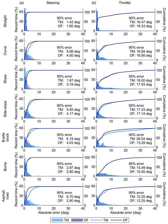 Histograms of the absolute error for (a) the steering angle and (b) the throttle angle. The dark blue and light blue bars/lines represent the estimated data obtained using the optical flow (OF) and template matching (TM) approaches, respectively. Each graph also indicates the 90th percentile error for each condition.