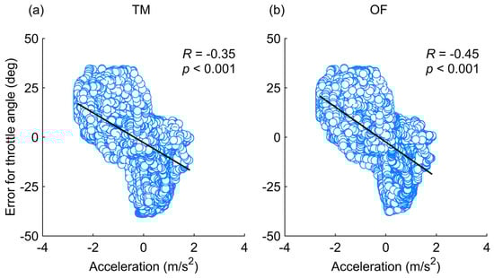 Correlation between the estimation errors (estimated value minus true value) for the throttle angle and forward acceleration using (a) template matching (TM) and (b) optical flow (OF) approaches. Each graph displays the Spearman’s rank correlation coefficient (R) and p-value.