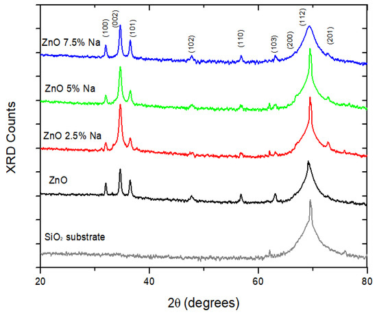The X-ray diffraction patterns of undoped and Na-doped ZnO thin films are compared in Figure 2.