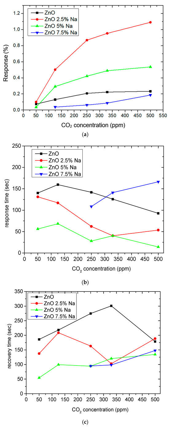 (a) Response, (b) response times, and (c) recovery times of pure ZnO, 2.5% Na-doped, 5% Na-doped, and 7.5% Na-doped sensing films.