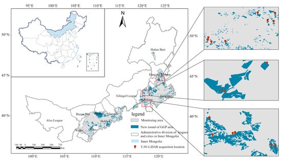 The ground survey data for this study were collected from representative GGP stands in Inner Mongolia, with sample plots established across six county-level administrative regions: Horqin Right Wing Middle Banner, Duolun County, Linxi County, Songshan District, Qingshuihe County, and Jungar Banner. A total of 79 sample plots were surveyed during 2023 and 2024, and the major tree species of GGP stands were poplar, Mongolian Scots pine, and Chinese red pine. In this study, we selected a homogeneous forest plot with an area larger than 120 m × 120 m located in the fallow forest plot, and we laid a 30 m sample line in a due north direction and two other 30 m sample lines at 60° intervals, with the midpoints of the three sample lines intersecting at the center of the sample plot. A series of parameters were recorded during the field survey, including the RTK coordinates of the sample centers; geographic information such as elevation; and the diameter at breast height (DBH) of individual trees, tree height, crown width, and the number of trees in the sample plots.