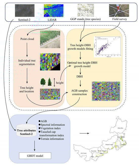 The methodology of this study is divided into two main parts, as shown in Figure 2. One part focuses on the construction of AGB samples, while the second part involves the estimation of AGB using machine learning methods.