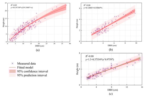 This study utilized tree heights obtained from individual tree segmentation to select the optimal growth model for each corresponding species to estimate DBH. Using the growth models listed in Table 2, we fitted and analyzed field-surveyed individual tree height and DBH data for three major species (Table 4). The performance metrics of the models showed minimal differences across the dominant species; thus, the tree height–DBH growth model with the best evaluation metrics, combined with tree heights derived from LiDAR data, was applied to estimate the DBH of individual trees for each species within the LiDAR data. Figure 3 illustrates the optimal tree height–DBH growth models identified for the three major tree species.
