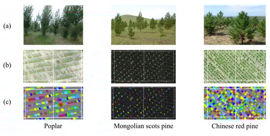 Example of AGB sample construction: (a) photos of measured sample plots; (b) LiDAR point cloud data; (c) individual tree segmentation. Different colors in (c) represent a separate tree.