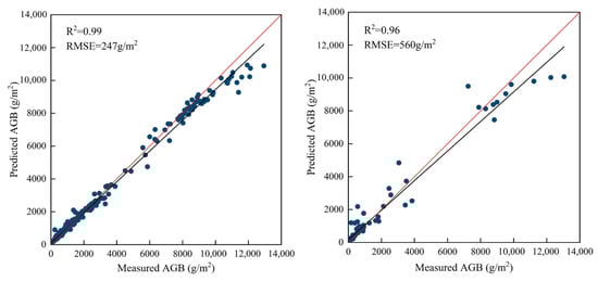 Based on the optimal parameters, this study utilized the gradient boosting decision tree regression algorithm to construct the AGB estimation model, and the results of model training and validation are shown in Figure 6, with a model training accuracy of R2 = 0.99 and RMSE = 247 g/m2 and a model validation accuracy of R2 = 0.96 and RMSE = 560 g/m2, which showed that the overall results of the AGB estimation model are good.