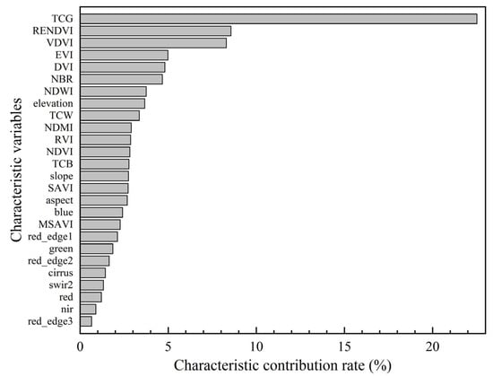 In this study, a total of 26 variables were derived from optical imagery, terrain data, and auxiliary datasets. Using the gradient boosting decision tree regression algorithm, the contribution rates of each variable to the AGB estimation model were ranked based on their importance. The results, as presented in Figure 7, indicate that the three most influential variables are “TCG”, “RENDVI”, and “VDVI”. This highlights the significant role of the tasseled cap transformation index and vegetation indices in capturing critical spatial variations in AGB. Among these, the contribution rate of the tasseled cap transformation index far surpasses the other variables, underscoring its pivotal role in the biomass estimation model. This phenomenon can likely be attributed to the fact that the tasseled cap transformation incorporates critical structural and compositional information. It effectively reduces the influence of soil brightness in the imagery while enhancing the greenness component. This effect becomes increasingly pronounced with greater vegetation coverage, as the transformation accentuates the spectral differences associated with varying levels of vegetation density.