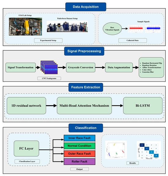 This study builds upon these advancements by proposing a novel hybrid deep learning approach for bearing fault diagnosis. The proposed model integrates CWT with a deep learning framework combining MHSA, BiLSTM, and 1D conv ResNet. This integration enhances feature extraction, suppresses noise, and improves the model’s ability to learn temporal dependencies from nonstationary and nonlinear vibrational signals. Unlike conventional CNNs, the inclusion of MHSA allows the model to focus on critical signal regions, while BiLSTM captures long-term dependencies essential for accurate fault identification. The effectiveness of the proposed model is evaluated using both a controlled laboratory bearing dataset and the publicly available Paderborn bearing dataset to assess its generalizability across different fault conditions. The model achieves superior classification performance, demonstrating high precision, recall, and robustness in distinguishing fault types. The results confirm the model’s suitability for real-time predictive maintenance, offering an efficient and reliable solution for intelligent fault detection in industrial applications. The key innovations and contributions of this study are as follows: