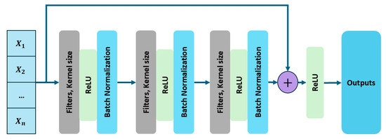 where is the input signal, represents the learned transformation through a series of convolutions, and is the final output. The presence of the identity mapping ensures that essential signal characteristics are preserved, preventing excessive modifications that could affect fault-related features in vibration signals. Each block applies multiple 1D convolutions sliding over time to extract local and global patterns. The convolution operation is defined as: