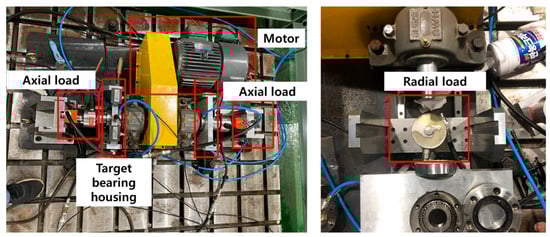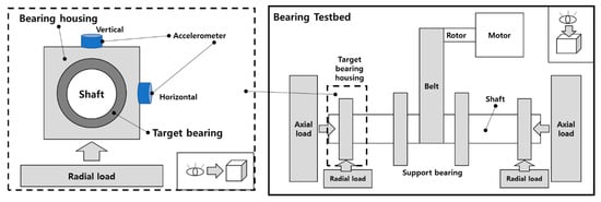 Figure 5 depicts the structure of the bearing testbed developed by the Ulsan Industrial Artificial Intelligence (UIAI) Laboratory at Ulsan University, Ulsan, Republic of Korea, which was utilized for this analysis. The collected data were categorized into four distinct bearing conditions: normal, outer race damage, inner race damage, and roller damage. During the experiment, a three-phase motor operated the testbed at a constant speed of 1800 rpm. The rotational motion was transferred from the rotor shaft to the main shaft via a belt system installed on both sides of the test bearings. The bearings used in this study were FAG NJ206-E-TVP2 cylindrical roller bearings made of chrome steel (AISI 52100), subjected to a constant vertical load of 100 kgf. Artificial defects were introduced with dimensions of approximately 3 mm × 0.3 mm × 1 mm to simulate real fault conditions. To ensure precise data acquisition, the maximum vibration signal was recorded from the left side of the target bearing using both a vibration sensor and an acoustic emission (AE) accelerometer. A schematic representation of the complete experimental setup is provided in Figure 6, offering a detailed overview of the testbed configuration and data acquisition process.