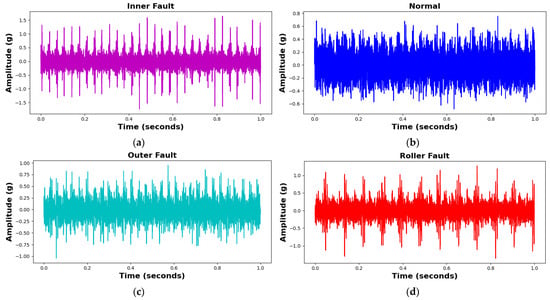 Vibration time domain signals for different bearing fault conditions: (a) IRF, (b) NC, (c) ORF, and (d) RF.