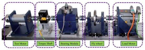 The experimental test rig developed by Lessmeier et al. [42] for vibration data acquisition consisted of several key components, as illustrated in Figure 9. Designed as a versatile platform, it enabled the testing of bearings under various fault conditions, allowing for precise fault characterization and analysis. At the core of the setup, the bearing test module facilitated controlled testing by applying a constant radial load to the test bearings, adjustable up to 10 kN before each experiment. This ensured consistency and repeatability across different testing conditions. The system was powered by a 425 W permanent magnet synchronous motor (PMSM) with a nominal torque of 1.35 Nm, a rotational speed of 3000 rpm, a nominal current of 2.3 A, and four pole pairs. Manufactured by Hanning Elektro-Werke GmbH & Co. KG (Model: SD4CDu8S009), the motor was controlled using an industrial inverter (KEB Combivert 07F5E 1D-2B0A, Oerlinghausen, Germany) with a 16 kHz switching frequency, effectively replicating real industrial environments, including PWM-induced noise typically found in such systems. To capture vibration signals, a piezoelectric accelerometer (Model 336C04, PCB Piezotronics, Inc., Depew, NY, USA) was securely mounted on the bearing housing adapter. The signals were amplified using a Type 5015A charge amplifier (Kistler Group, Winterthur, Switzerland) and filtered through a 30 kHz low-pass filter, which removed high-frequency noise. The filtered signals were then digitized at a 64 kHz sampling rate, ensuring high-resolution data acquisition for precise fault analysis. To mimic real-world operational conditions, a flywheel and load motor were incorporated into the setup, simulating dynamic load variations and system inertia. The experiments were conducted under four distinct operating conditions, varying in rotational speed, radial force, and load torque, as outlined in Table 5.
