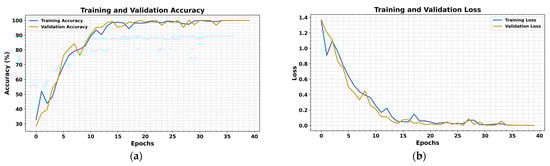 Proposed model training and validation. (a) Accuracies vs number of epochs and (b) losses vs number of epochs.