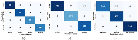 Confusion matrices of the proposed model on (a) UIAI, (b) Paderborn real, and (c) Paderborn artificial datasets, showing classification accuracy across fault classes.
