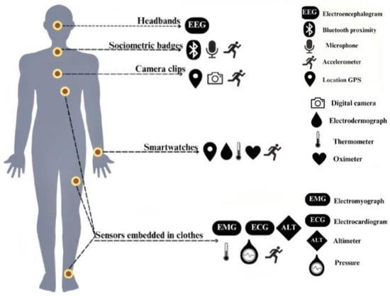 As depicted in Figure 2, wearable sensors are embedded with components for activity tracking and monitoring vital signs, functioning as real-time, non-invasive biosensors [22] capable of coordinating multiple sensor inputs [24]. These sensors act as intelligent monitors, offering continuous feedback on the user’s physiological state. Broadly defined, wearable technology includes any body-worn or body-attached device capable of collecting, processing, and providing actionable data. These devices are often described as body-worn information interaction systems [15] and are distinct from traditional self-quantification tools due to their advanced sensory and analytical capabilities. Outfitted with sensitive actuators and sensors, wearable devices collect and store physiological data related to body functions. These data are subjected to cleansing and intelligent processing, enabling the delivery of specific, actionable feedback to users. The defining characteristics of wearable technology are two-fold: the ability to collect and process data, and the integration of embedded systems within wearable devices. Data collection involves the sensing and capture physical activities or physiological characteristics, encompassing processes such as information acquisition, data recording, and advanced analytical processing. This highlights their data acquisition and management capabilities. Embedded wearable systems differentiate themselves from traditional embedded computing through the integration of precise sensors, actuators, and miniaturized storage units within flexible garments or materials. This integration enables seamless human–computer interactions, facilitating real-time data exchange and responsiveness between the user and the device. Wearable technology supports the integration of various sensor types, capable of measuring mechanical (i.e., position, displacement, acceleration, force), acoustic (i.e., volume, tone, frequency), biological (i.e., heart rate, temperature, neural activity, breathing rate), optical (i.e., refraction, light wave frequency, brightness), and environmental (i.e., temperature, humidity) information. This “sensing” capability allows wearable devices to adapt dynamically to their owner, location, and activity, ensuring responsiveness and personalized functionality.