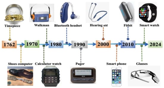 The current smart technology phase (2010–present) features AI-enhanced wearable ecosystems, including EEG headsets and multimodal biometric monitoring systems [26,27]. Unlike earlier computational wearables such as calculator watches, modern devices function as comprehensive sensor systems that monitor real-time physiological and environmental parameters. These devices typically fall into two categories, those designed to enhance information acquisition through sensor optimization and data analysis, focusing on metrics such as sleep quality and activity tracking, and those aimed at increasing portability for multifunctional devices, emphasizing convenience and information display, as depicted in Figure 3.