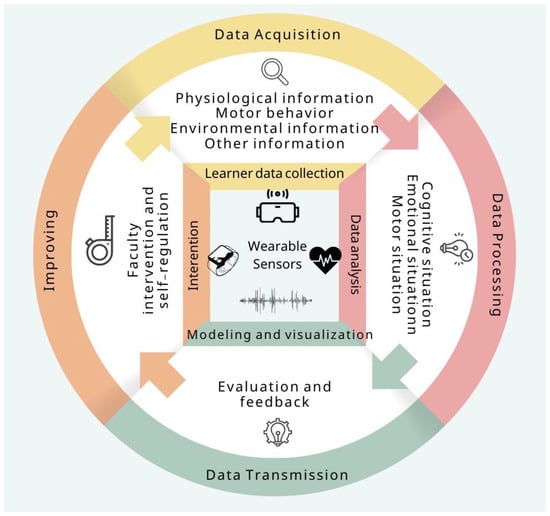 Learning analytics systematically measures, collects, analyzes, and reports learner-related data to enhance understanding and optimize learning processes [6,24]. As shown in Figure 4, wearable sensors play a crucial role by continuously capturing multimodal data, including physiological signals (e.g., EEG, ECG, EDA), motor behavior (e.g., accelerometers, gyroscopes), and environmental factors (e.g., temperature, noise levels) [35,36]. These data streams undergo preprocessing to remove noise and extract key features before being analyzed by machine learning models, which detect cognitive workload, engagement levels, and emotional states [5,25].