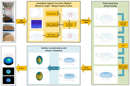 To overcome these limitations, this study proposes a warehouse level monitoring method that integrates MMW radar with 3D surface reconstruction techniques. We introduce an anomalous signal correction method that fuses angle and range features. This approach analyzes the spatial distribution and energy characteristics of radar echoes to correct abnormal points and enhance data reliability. MMW radar is employed to acquire point cloud data of the grain surface, which are then preprocessed before undergoing 3D surface reconstruction [] to generate a high-fidelity geometric model of the grain heap. This model is subsequently used to calculate the internal grain volume of the warehouse.