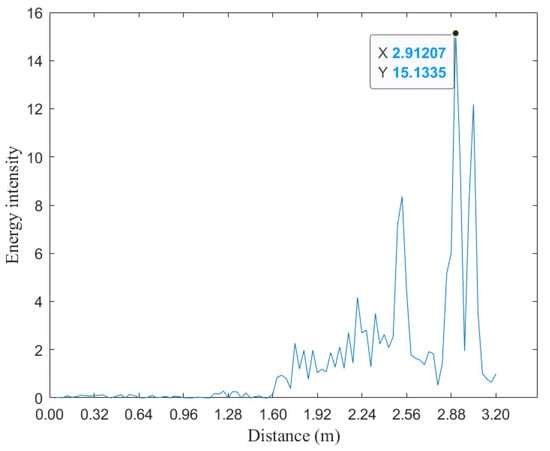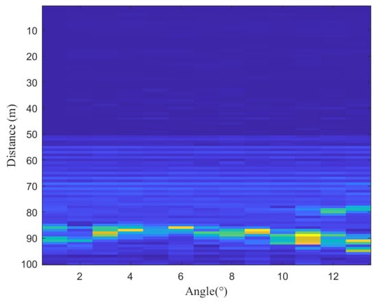 To improve target point determination accuracy, a multi-dimensional analysis is performed by integrating angle–range features. For each candidate target point , its angle  and radial distance  are used, along with the echo intensity , to construct an angle–range feature space. The confidence score  of each candidate target point is defined as a weighted combination of angle continuity  and energy trend consistency :