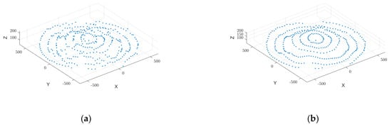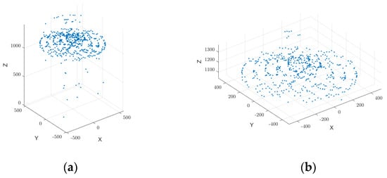 Following the correction of anomalous points, statistical filtering based on Euclidean distance classification was applied to refine the point cloud. The parameters  (number of nearest neighbors) and  (threshold coefficient) played a crucial role in controlling the filtering effect. A larger  meant more points were considered in the local neighborhood, increasing the constraints on the point cloud and removing more points. Conversely, a smaller  imposed stricter filtering conditions, resulting in a reduction in retained point cloud data. For the initial dataset containing 393 points, the filtered results are shown in Table 1.