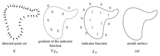 PSR fundamentally relies on point cloud normal vectors with consistent orientations. Given a set of point cloud data  and their corresponding normal vectors , the method constructs a continuous vector field  that converts discrete normal vector distributions into a field representation. This vector field is typically defined as the gradient of an indicator function , where  inside the object and gradually tends to 0 outside, ensuring that the reconstructed surface aligns with an isosurface of the function. In an ideal case, illustrated in Figure 9, if  is a smooth indicator function where the inside of the object is labeled as 1 and the outside as 0, then its gradient  will exhibit consistent alignment with surface normal vectors near the object boundary. By sampling the input normal vectors  into a global vector field , the reconstruction problem can be formulated as an optimization problem based on the Poisson equation. Mathematically, this requires finding a function  that satisfies the following condition: