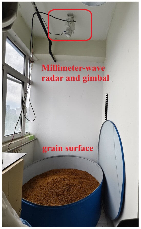 Data collection was performed in a simulated small-scale grain storage facility. The storage container was a cylindrical tank with a 65 cm radius, and after manually leveling the material, the height reached 11.5 cm, resulting in a measured volume of 152,564.75 cm3. The millimeter-wave radar was positioned directly above the grain storage tank, with its orientation and scanning controlled by a gimbal system. For this application, the radar frequency was set to 1.6 GHz. In its idle state, pointing vertically downward, it was positioned 3.12 m above the ground (Figure 10).