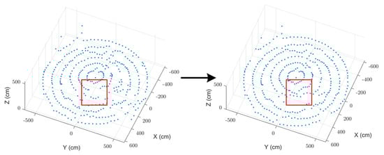where  is the neighborhood radius, and  is the number of neighboring points; if  falls below a threshold , the point  is classified as an outlier or jump point. This process effectively eliminates anomalous points caused by multipath effects or weak reflections, ensuring that the selected target points are reliable and consistent.