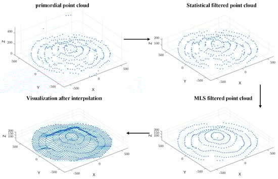 The Moving Least Squares (MLS) smoothing technique effectively eliminates sharp surface irregularities and local spikes in millimeter-wave radar-acquired point cloud data, as illustrated in Figure 7. By fitting localized polynomials, MLS enhances dataset smoothness and structural integrity, ensuring a continuous surface representation. This method significantly improves the quality of input data for 3D surface reconstruction and volume estimation, leading to more accurate and stable measurement results.