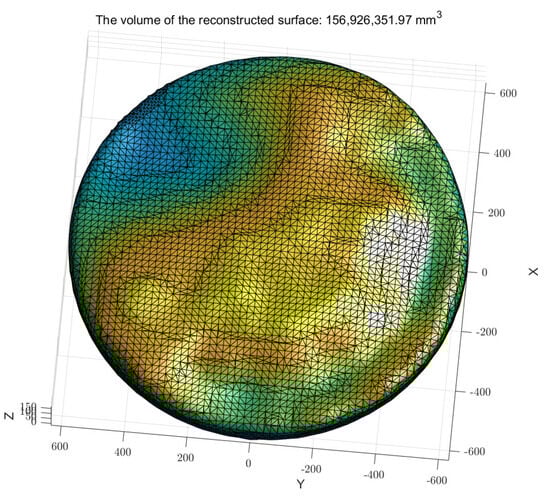 After completing point cloud data cleaning and enhancement, a 3D surface model was generated using Poisson Surface Reconstruction (PSR). This method constructs an implicit function and optimizes both point cloud data and their normal vector field, producing a smooth and closed 3D surface, as shown in Figure 13. Once the reconstructed surface model was obtained, the vector triple product method was used to calculate its volume. Figure 14 illustrates the reconstructed model used for this calculation. As shown in Table 2, compared with the actual volume of 152,564.8 cm3, the relative error was less than 3%, demonstrating the accuracy and reliability of the reconstruction process.