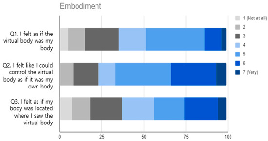 The participants reported a sense of embodiment, although their connection to the virtual body was moderate. In Q2, the participants demonstrated the highest sense of control over the virtual body. Participants rated their immersive experiences highly, particularly their ability to adjust to the virtual environment, as evidenced by their responses to Q6. The visual aspects also significantly contributed to their sense of immersion. The responses to statements about embodiment exhibited more variability than the statements about immersion, particularly to Q3, which suggests that the experience of embodiment may be a more subjective or context-dependent phenomenon for the participants.