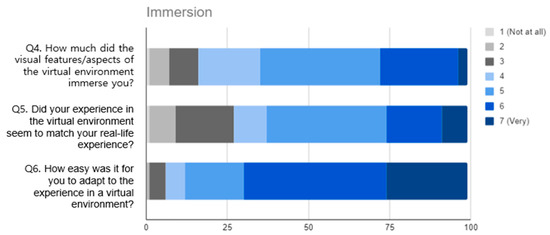 Regarding the immersion statements (Figure 4), the participants rated the ease of adaptation to the virtual environment (Q6) the highest, with a mean of 5.76 and the lowest variability (σ = 1.11). This result suggests that the participants generally found it easy to adjust to the virtual environment. The visual aspects of the virtual environment (Q4) were also rated highly (µ = 4.71, σ = 1.24), although slightly lower than the ease of adaptation (Q6). The immersion experience appeared to be consistent with the real-world experience (Q5), but this statement received a slightly lower mean (µ = 4.59, σ = 1.43) than the other statements.