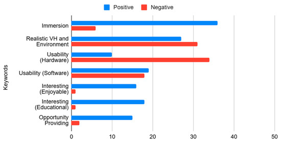 The factors contributing to the corresponding advantages were further examined by analyzing participants’ responses to open-ended questions. Additionally, we investigated whether any aspects were identified as disadvantages or potential limitations of IVR, VHs, or role-playing. To analyze the qualitative data from the open-ended questions, we assigned a score to each key term based on the participants’ responses. First, keywords were identified, and their connotations were classified as positive or negative. Subsequently, the frequency of the appearance of each keyword within each element was calculated to generate a score.