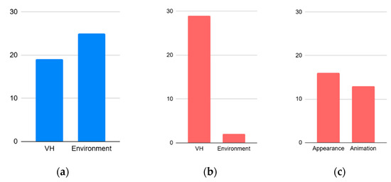 Results of responses: (a) Positive responses of participants for VH and environment post-test questions: “What did you like about the VR content?”; (b) Negative responses of participants for VH and environment “What was bad about the VR content?”; (c) Negative responses of participants on VH regarding appearance and animation.