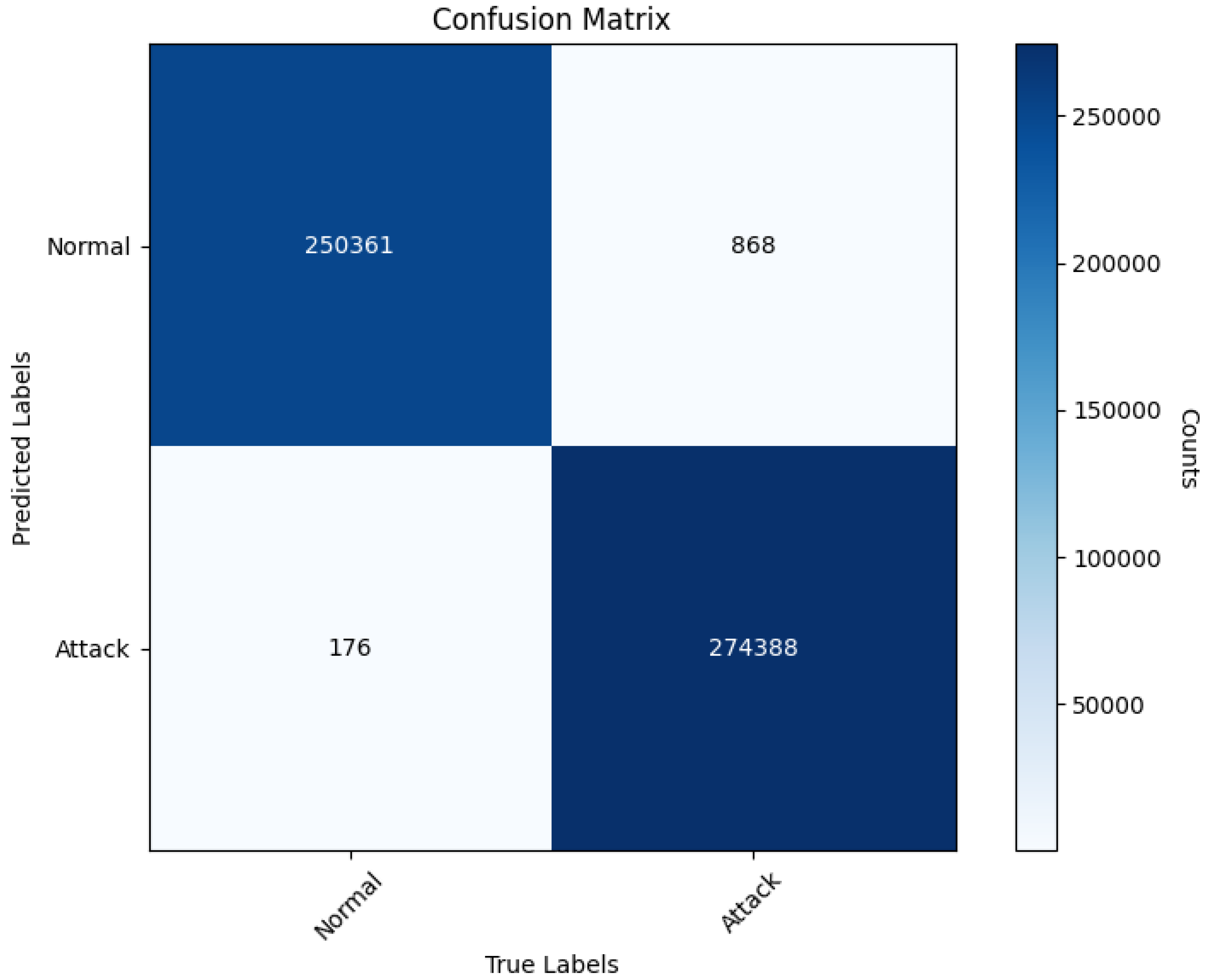 In this section, the model was evaluated and analyzed using the CIC-IDS2017 dataset. The confusion matrix for the experiment is presented in Figure 4. The findings indicate that the model successfully predicts the majority of both normal and attack traffic instances. However, 868 instances of normal traffic were incorrectly classified as attacks (false positives), and 176 attack instances were misclassified as normal traffic (false negatives). Upon examining the distribution of classification errors, it is evident that the number of false positives slightly exceeds that of false negatives. This may be attributed to certain normal traffic patterns being closely aligned with attack patterns within the feature space. Particularly at the boundaries where feature overlap occurs, these instances are prone to misclassification. Although the Borderline-SMOTE technique alleviated the issue of class imbalance, real-world network environments often exhibit high variability and unpredictability in attack behaviors. This could result in some abnormal sample features resembling normal behaviors, thereby causing incorrect predictions. Based on the confusion matrix, the model achieves an accuracy of 99.80%, a precision of 99.69%, a recall of 99.94%, an F1-score of 99.81%, an AUC of 0.9987, a false positive rate (FPR) of only 0.0034, and a detection rate (DR) of 99.94%. These metrics suggest that the model performs exceptionally well in intrusion detection tasks. It effectively distinguishes between normal and attack traffic while maintaining low rates of false alarms and missed detections, thus showcasing its robustness and dependability.