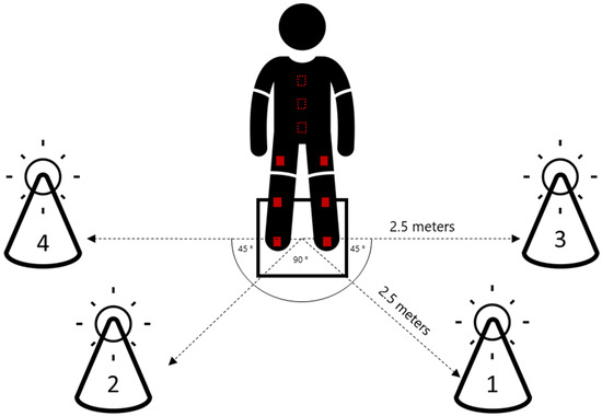 Graphical representation of task setup. All lights are positioned on cones 2.5 m away from the starting square. Participants were asked to run as fast as possible to the initiated light and turn it off by swiping the hand within 40 cm above the light. To quantify kinematics, all subjects wore IMUs placed at the feet, shanks, thighs, pelvis, T12, and C7 (red boxes/squares).