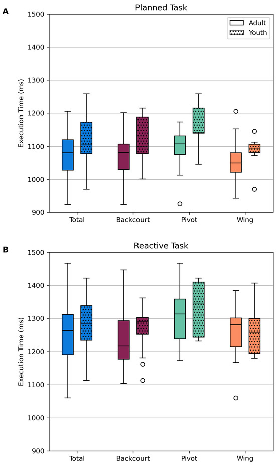 At the time of testing, the adult handball players were significantly older (median difference = 7 years, p < 0.001), taller (median difference = 6.5 cm, p = 0.025), and heavier (median difference = 12.15 kg, p < 0.001) than the youth players (Table 1). Pivots were significantly taller when compared to backcourt players (median difference = 4.5 cm, padj < 0.001) and wing players (median difference = 9.5 cm, padj < 0.001) (Table 2). Additionally, pivots were also significantly heavier than backcourt players (median difference = 14.9 kg, padj < 0.001) and wing players (median difference = 22.9 kg, padj < 0.001). Backcourt players were significantly taller (median difference = 5 cm, padj = 0.032) and heavier (median difference = 8 kg, padj = 0.030) than wings. A two-way repeated-measures ANOVA on execution time data identified main effects for condition (planned, reactive), age group (adult, youth), and playing position (wing, backcourt, pivot) (Figure 2). Execution times were shorter during the planned task than in the reactive task, with a mean difference of 182 milliseconds (F(1,86) = 344.41, p < 0.001, η2p = 0.80). Adults were faster than youths, with a mean difference of 33 milliseconds (F(1,86) = 4.52, p = 0.036, η2p = 0.05). Pivots were slower than backcourt and wing players (F(2,86) = 4.07, p = 0.020, η2p = 0.09), with mean differences of 45 milliseconds (p = 0.029) and 50 milliseconds (p = 0.033), respectively. No significant interaction effects were found (p > 0.05).