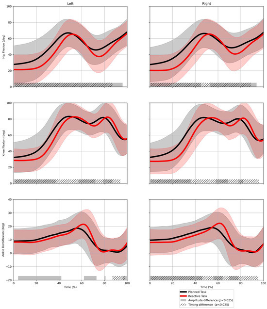 In the reactive condition, significant timing differences compared to the planned condition were found across all joints (Figure 3). These differences indicate that movement responses were delayed during the reactive task. SnPM also identified significant amplitude differences for all joints between the conditions (Figure 3). During the reactive task, players exhibited less hip flexion in two parts of the movement task, between approximately 0–40% and 60–90% of normalized time. Knee flexion was also significantly lower between approximately 0–35% and 60–70% of the movement response. Ankle dorsiflexion showed amplitude differences similar to the hip and knee, but also increased peak at around 65% of the movement response.