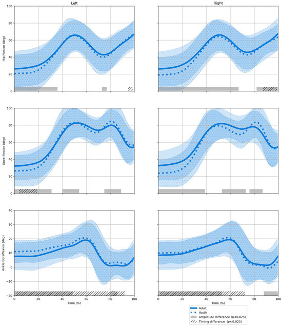 When comparing age groups, very few significant timing differences were identified at the hips and knees (Figure 4). Only the sagittal movement at the ankle appears to feature prevalent timing differences. Between the age groups, several significant amplitude differences were found across all joints (Figure 4). Youth players moved with less hip and knee flexion between 0 and 30%, whereas they showed greater peak knee flexion at around 80% of the movement response.