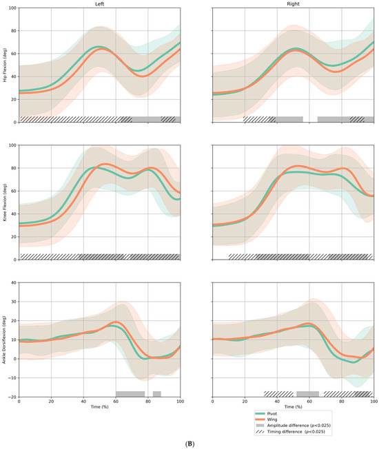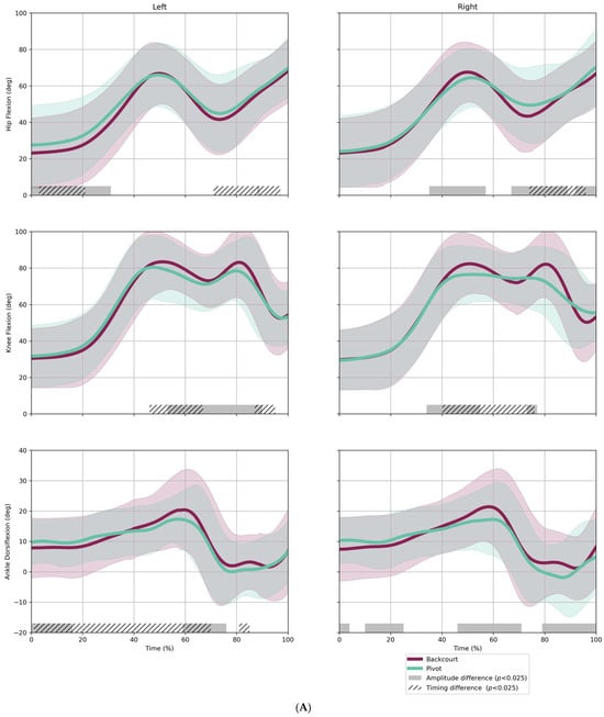 When comparing backcourt players to pivots (Figure 5A), significant timing differences were found for the hips around 70–90% and for knees between approximately 45 and 65% of the movement task. Moreover, SnPM found significant amplitude differences across all joints. Pivots moved with more hip flexion and ankle dorsiflexion, but with less knee flexion than backcourt players. When comparing wing players to pivots, significant timing differences were very prevalent in the hips and knees (Figure 5B). SnPM also identified significant amplitude differences, with pivots moving with more hip flexion than wing players around 65–100% of the movement response. In turn, wing players moved with more knee flexion in two parts of the movement, around 40–60% and 70–100% of normalized time. Wing players also showed greater ankle dorsiflexion than pivots, especially for the peak at around 60% of the movement response.