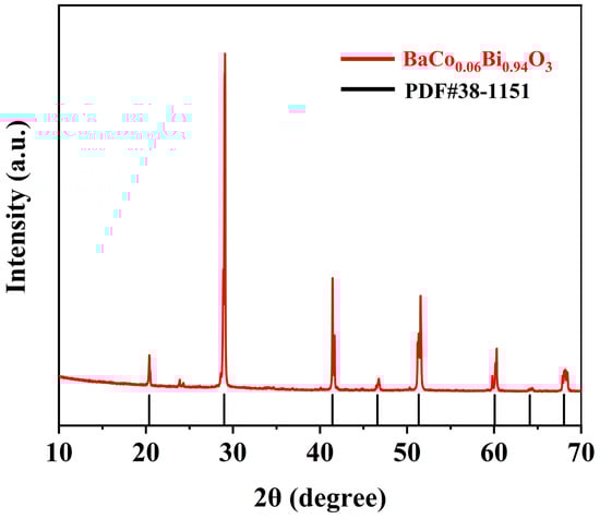 NiZn ferrite ceramic samples were prepared using the oxide ceramic method. High-purity BaCo0.06Bi0.94O3 precursors (BaCO3, Co2O3, and Bi2O3, purity ≥99.99%, purchased from Aladdin, Shanghai, China) were precisely weighed and mixed with deionized water according to stoichiometric ratios, followed by 6-h planetary ball milling. The mixed powder was then pre-sintered in a muffle furnace at 725 °C for 2 h to complete solid-state reactions.