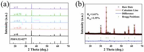 Bulk density was determined by the Archimedes drainage method using a precision densitometer. Crystal structure analysis was performed with an Empyrean PIXcel3D X-ray (PANalytical, Almelo, The Netherlands) diffractometer, with diffraction data refined by Jade 6.5 software using the Rietveld method. Microstructural characterization and elemental distribution analysis were conducted using a QUANTA 450-FEG (FEI Company, Hillsboro, OR, USA) field-emission scanning electron microscope equipped with an energy-dispersive spectrometer (EDS, Oxford X-Max20, Oxford Instruments plc, Oxford, UK). Complex permeability spectra were measured by an Agilent E4991B (Agilent Technologies Inc., Santa Clara, CA, USA) impedance analyzer. The hysteresis loop is obtained by multiple measurements using the Lake Shore 7404-S (Lake Shore Cryotronics Inc., Westerville, OH, USA) vibrating sample magnetometer. X-ray photoelectron spectroscopy (XPS) was obtained by the ESCALAB 250 XI (Thermo Fisher Scientific Inc., Waltham, MA, USA) spectrometer.