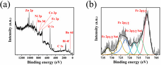 The surface structure of the composite NiZn ferrite ceramics was characterized by XPS. As shown in Figure 3a, the characteristic peaks of Ba 3d, Co 2p, and Bi 4f can be clearly identified in the full spectrum of BaCo0.06Bi0.94O3 doped samples. XPS spectra combined with XRD patterns can further illustrate that the formation of the NiZn ferrite phase structure is not affected by additives or the successful introduction of additives. Figure 3b further demonstrates the high-resolution XPS spectra of 0.75 wt% BaCo0.06Bi0.94O3-doped NiZn ferrites sintered at 900 °C. The peak positions of Fe 2p and Fe 2p can reflect the valence state characteristics of iron ions: the sample shows a significant main peak of Fe 2p3/2 at 710.8 eV and 713.7 eV, Fe 2p1/2 at 725.2 eV and 722.2 eV, and a typical satellite peak appears near 719 eV, 732.5 eV, indicating that the iron element in the system exists in the form of Fe3+, and the characteristic signal of Fe2+ is not detected [22]. This result indicates that the electron transfer between Fe3+ and Fe2++ is weak, which may be one of the important mechanisms for the low magnetic loss characteristics of the doped NiZn ferrite [23,24].